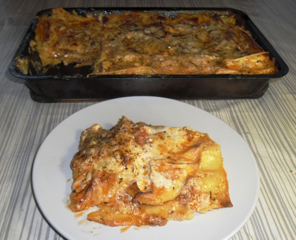 Слои лазаньи я делаю по-разному, в зависимости от настроения. Лапша — крупные квадраты лапши для бешбармака (у нас для местных казахов из Казахстана такую возят, неплохая замена специальным листам для лазаньи), перемежается слоями соуса «бешамель» (обжаренная на сл. масле мука тушится в молоке с мускатным орехом), обжаренного мясного фарша с луком и чесноком в томатном соусе «болоньезе» с базиликом (как вариант — томатная паста, кетчуп или лечо) и тёртым сыром. Верхний слой — из сыра и смесь итальянских трав. Запекается минут 20 потом 10 минут «доходит» в духовке без огня.