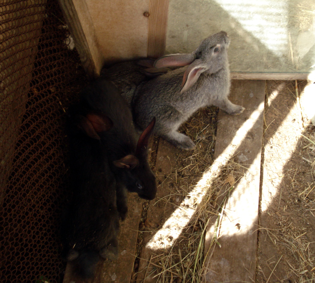Крольчата сегодня под бурные вопли Блейка были переселены «к нему», в уличный вольер-цыплятник и прячутся от солнца (+32) и от того самого Блейка.