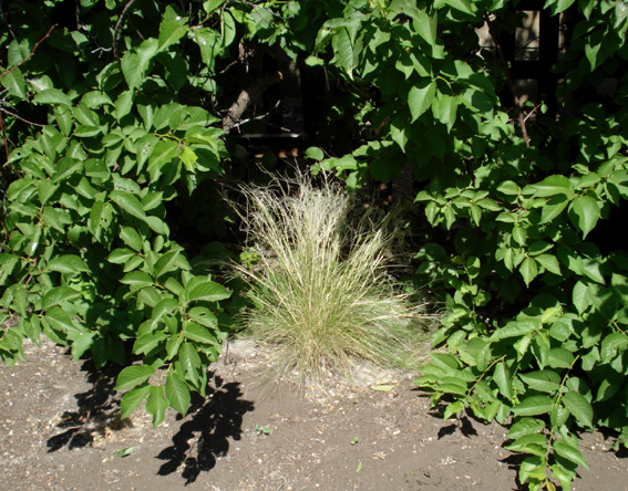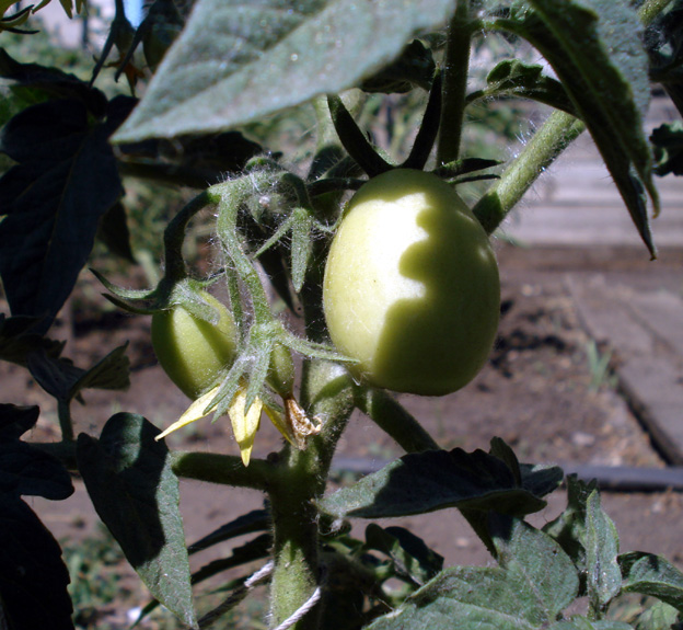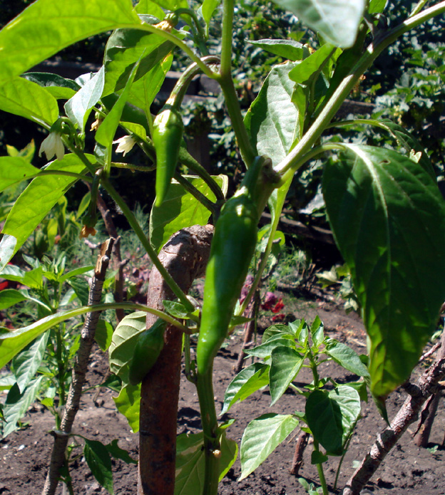 А это — будущий урожай: острый красный перец обогнал своего болгарского тёзку, а низкорослые помидоры уже зреют, в отличие от вымахавших мне по пояс «быков». Ковыль спрятался под сливы.
