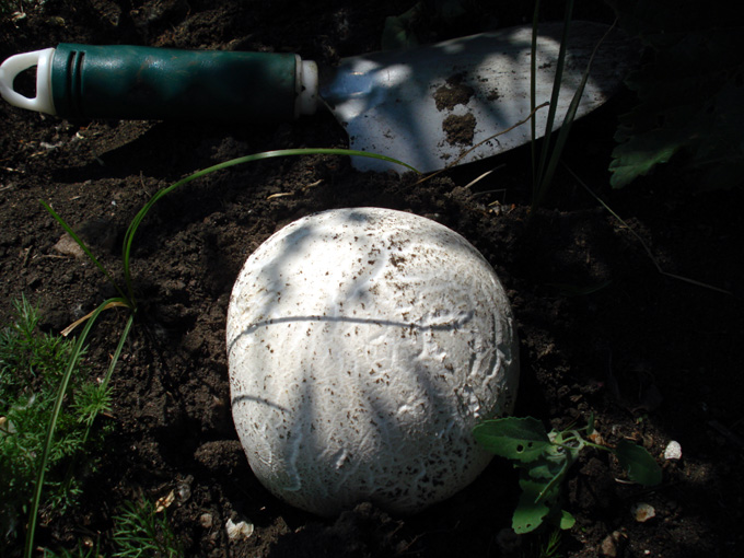 Чудеса начались в огороде. Знаете что на фото сверху? Я издалека подумал, что это мяч от соседей залетел. Подойдя ближе удивился размерам шампиньона, но оказалось, что это ДОЖДЕВИК! Ровно 500 г! Если хотите посмотреть, что из него вышло, загляните сюда.