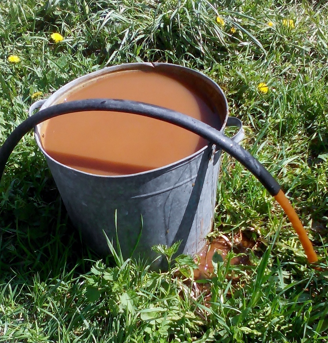 Для этого пришлось вызванивать администрацию, там выяснили, что у соседей вода есть, я сорвался с работы, разобрал замурованный колодец, открутил вентиль — когда после отключения воду дали, грязь забила трубу. На фото виден цвет «напитка» (ср. с фото ниже). Я снова на работе, а вода бежит на землю, чтобы посветлеть хоть немного.