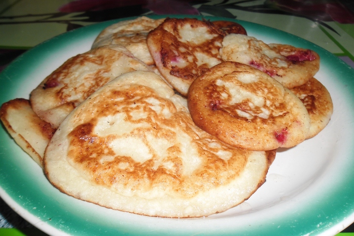 На фото видно, что оладьи — с припёком, то есть с ягодами — обожаю красную смородину в оладьях, но можно и без припёка.