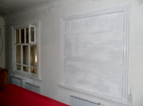 Занимался одной стеной (той, где вскоре встанет всё кухонное оборудование). Стена была разбита дырами от гвоздей, трещинами, рама была серой и убитой, гипсокартон в соседнем окне — с фабричной маркировкой, короче, ужас. Шпатлевал стены, красил окна. Вот результат: