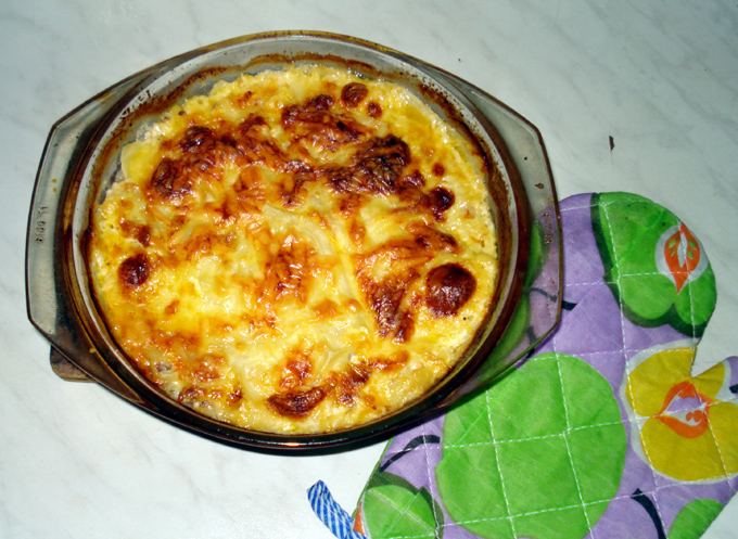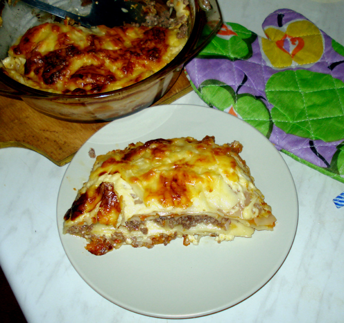 А к вечеру приготовил лазанью, для которой использовал лапшу под названием… бешбармак (вообще-то, это одно и то же, только казахи и итальянцы разные слова используют). На этот раз в слоях были: морковная икра, творог с сыром, фарш с луком, опять икра, опять сыр, всё это залито молоком и запечено в духовке.