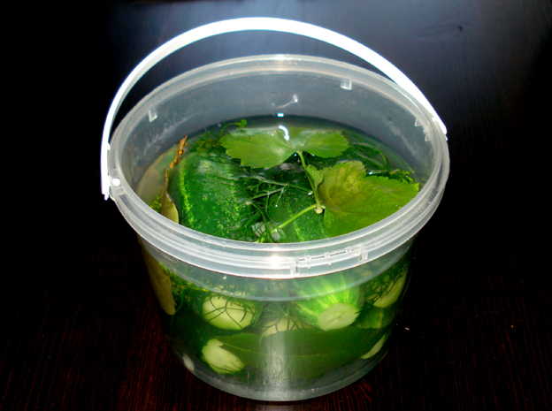 Кидаем всяких приправ: чеснок, укроп, лист вишни, смородины, лавра, ложку соли на пол-литра воды, заливаем горячей водой. Как остынет — можно есть!