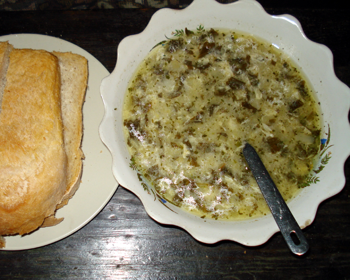 В двух словах: варим бульон, потом — капусту (можно с одним щавелем, но это со свежим), чуть позже — щавель (вымоченый и нарезаный мелко), потом — картошку, сухой укроп и петрушку, спассированный лук, я добавляю ещё взбитое яйцо (тонкой струйкой) в кипящие щи. Подаём со сметаной. Всё. 🙂