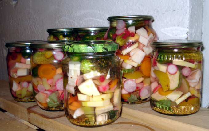 Вскрыл и наконец попробовал салат-ассорти. Очень вкусно. Правда, банки, в которых были груши и красная смородина, не выжили, взорвались. Отсюда мораль: не верь интернет-рецептам, делай как здравый смысл подсказывает.