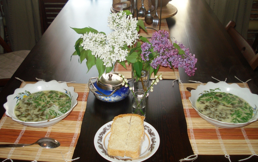 На завтрак давали овсянку с тыквой. А это — наш ужин (первый). Будет ещё второй, после баньки — пирожки с мясом подоспеют. А здесь — щи со щавелем, рецепт коего и детальное фото уже выложены в сообществе «Просто и вкусно».