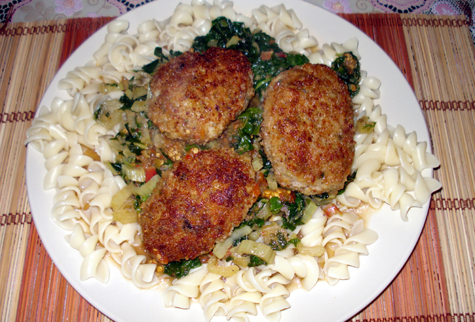На этот раз кроличьи котлеты томились на подушечке из тушащегося мангольда с небольшой добавкой баклажанов в томатном соусе.