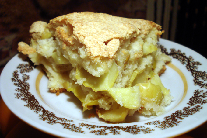 Рецепт: 500г яблок дольками, 3 яйца, по стакану сахара и муки, разрыхлитель или сода. Сливочным маслом смазываем форму, посыпаем панировочными сухарями, выкладываем яблоки, заливаем тестом, ставим на полчаса в не очень жаркую печку… наслаждаемся!