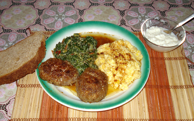 Потом пробовал дайкон (гигантская японская редька-редиска, с корневищами по 30 см), понравился мне сей овощ, надо будет снова посадить. А ужин получился такой: пюре из репы (на четвёрочку), мангольд, тушёный в сметане с котлетами и тёртым дайконом.