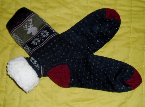 Тогда мне подарили белый поварской колпак (рождественский, с надписью «Christmas Cook»), а нынче — первые в моей жизни рождественские носки (в которые подарки Санта прячет) с рождественским оленем и блёстками на подошве (чтобы не стирались). Фантастика! А ещё всякие гостинцы типа овечьего и козьего сыра, чая из Челси, и разных фруктов-овощей. Спасибо!