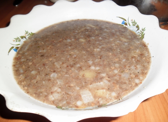 «Нежным» суп называется потому, что обжаренные грибы (любые боровые, в данном случае — маслята) варятся не кусочками, а пюрированными в блендере. Отдельно до полу-готовности отвариваем гречку, в грибной бульон (после 10 минут кипения) закладываем картошку, гречку, лапшу, через 10 минут — обжаренный в сливочном масле до прозрачности лук и специи.