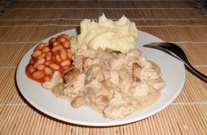 Обжариваем лук (четверть кольца), затем, на сильном огне, кусочки филе индейки, добавляем обжаренные белые грибы, соль, перец, заливаем молоком (сливками) чтобы только покрыть содержимое сотейника и тушим минут 15 на медленном огне. Всё! Очень быстро и очень вкусно!