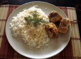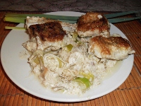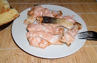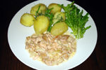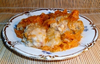 Морской окунь, запечённый с картошкой под сметанным соусом (Морской окунь, картошка, перец сладкий, лук, белые грибы, помидоры, сыр, сметана) |