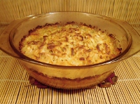 Картофельная запеканка с луком пореем (Картофель, лук порей, сыр, сметана, яйца, масло, мускатный орех). |